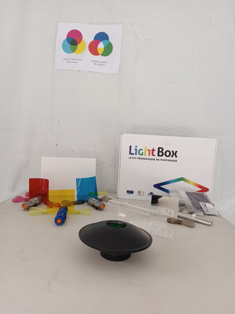 Atouts Science se développe aussi avec la mise en place d’un kit pédagogique, le Kit Lightbox, que le DIM QuanTiP a eu l’occasion d’utiliser à maintes reprises. Depuis quelques années, ce kit permet de découvrir par l’expérience les propriétés de la lumière : diffraction, synthèses des couleurs, réflexion, imagerie humaine, fibre optique…